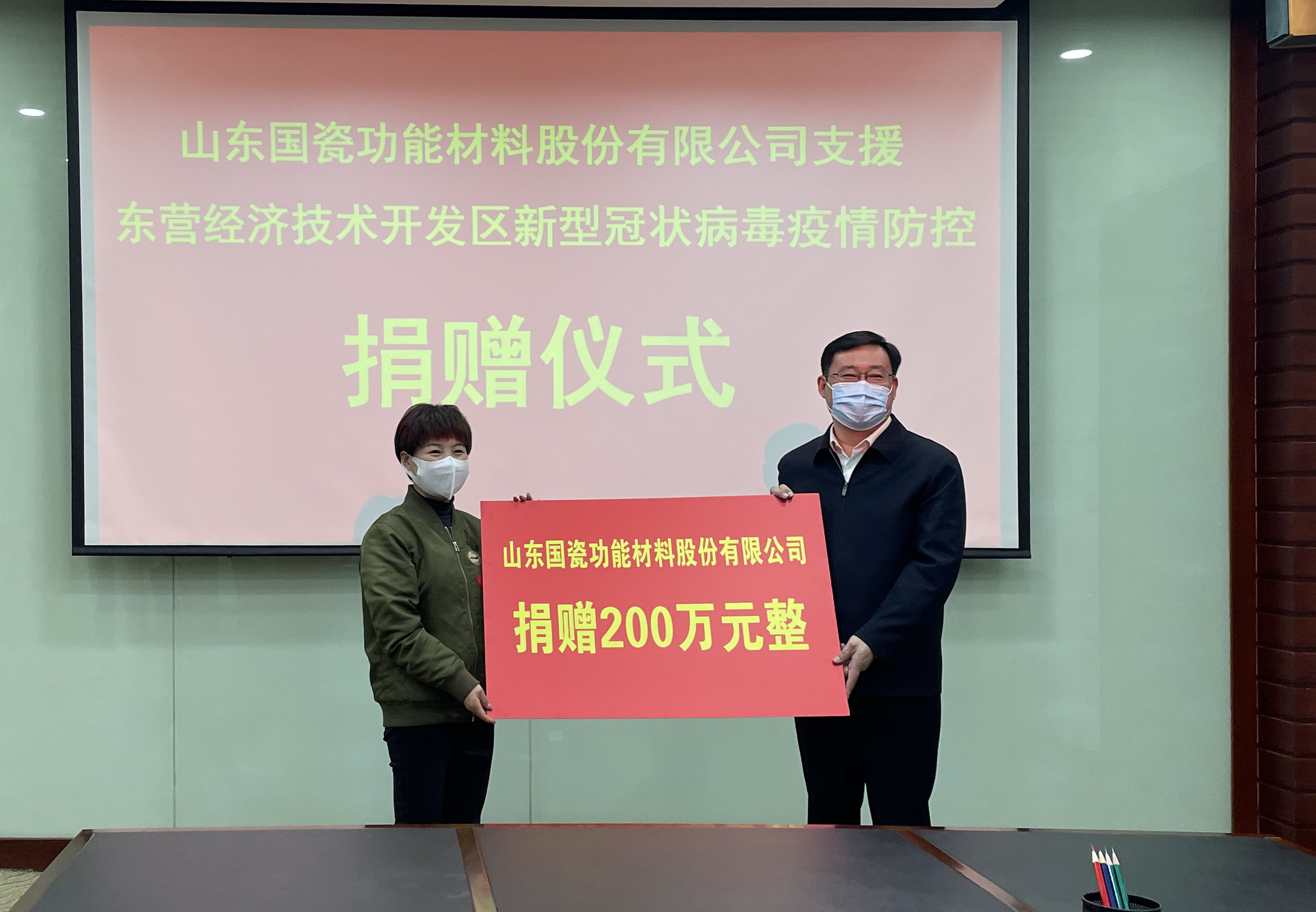 3月23日下午,公司副总经理许少梅代表公司向东营经济技术开发区定向捐赠200万元,用于开发区疫情防控工作。开发区党工委副书记张和森代表开发区接受捐赠,并颁发捐赠证书。